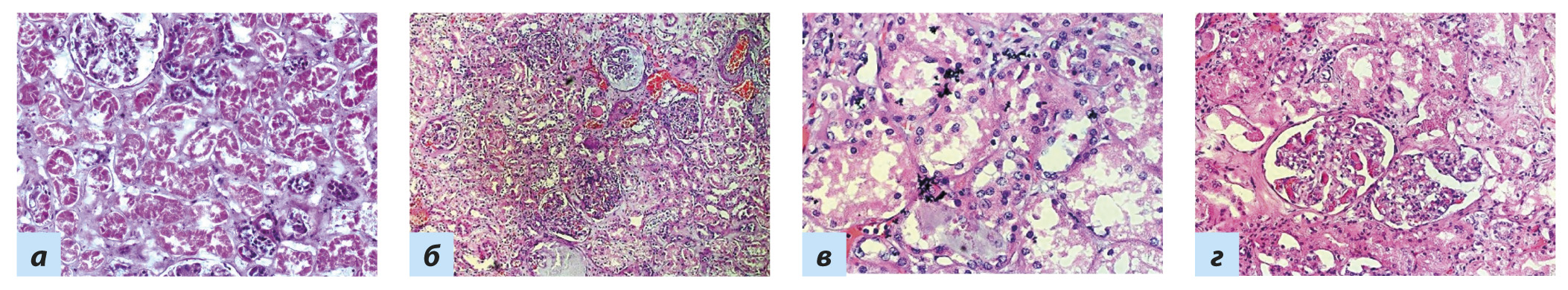 Рис. 12. Почка: a — некроз эпителия извитых канальцев; б — коллабирующая гломерулопатия с выпотом в полость капсулы клубочков; в — вирусное повреждение эпителия извитых канальцев; г — микроангиопатия с тромбами в капиллярах клубочков Примечание. Окраска гематоксилином и эозином, a — ×250, б — ×60, в — ×120, г — ×400.