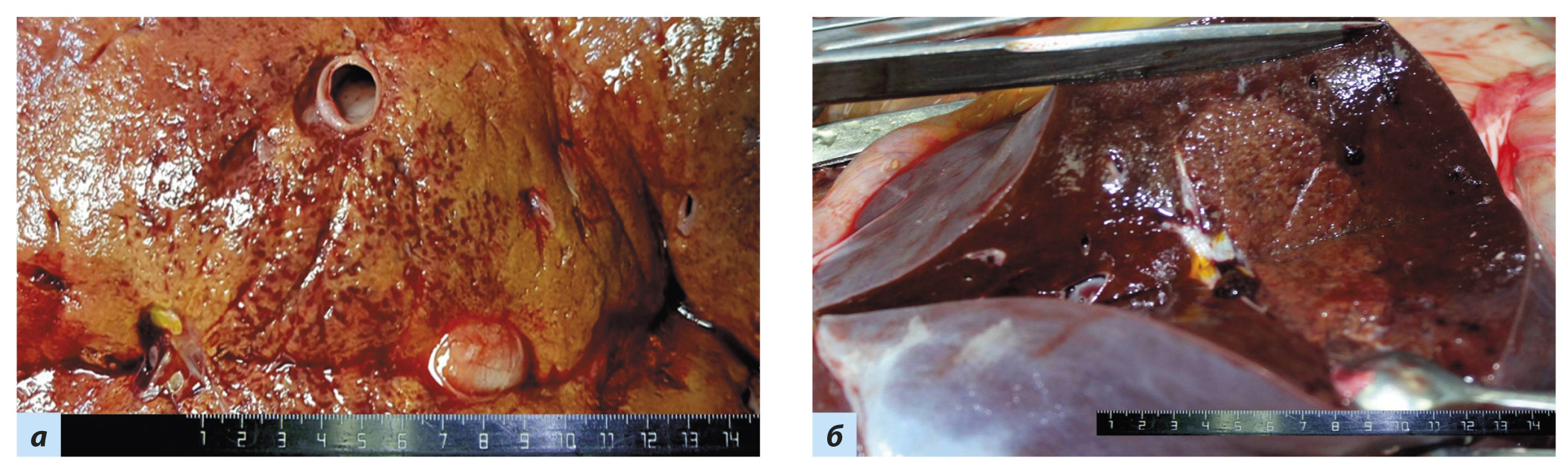 Рис. 13. Печень: a — выраженная жировая дистрофия с петехиальными кровоизлияниями; б — обширные гипоксические некрозы