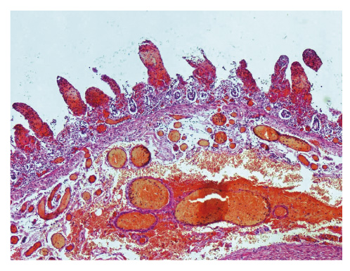 Рис. 14. Тонкая кишка, посмертный аутолиз: полнокровие сосудов, сладжи эритроцитов, кровоизлияния, особенно выраженные в ворсинах с их разрушением, отёк собственной пластинки и подслизистого слоя Примечание. Окраска гематоксилином и эозином, ×120.