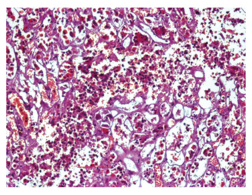 В органах эндокринной системы выявлялось выраженное полнокровие микроциркуляторного русла с тромбозами, кровоизлияниями вплоть до формирования обширных геморрагических некрозов, в частности гипофиза и надпочечников (рис. 15).