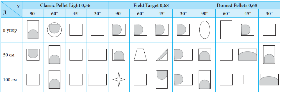 При выстрелах из пневматического пистолета МР-53М по искусственной коже с рельефной поверхностью и подклеенной текстильной сеткой к изнанке под разным углом и с разного расстояния пулями с полушаровидной формой головного конца преобладающая форма повреждения (дефекта) — квадратная (табл. 1). В случаях, когда кусок ткани выбивается не полностью, а остаётся лоскут, то основание его в большинстве случаев располагается снизу. Прослеживается также зависимость формы повреждения (дефекта) от дистанции выстрела. При выстрелах с дистанции в упор чаще образуются повреждения (иногда дефекты)округлой равносторонней формы. С увеличением дистанции выстрела (50 и 100 см) форма повреждения чаще была овальной. При выстрелах под более острым углом для всех видов пуль характерно изменение формы повреждения (дефекта) от исходной, практически квадратной, к прямоугольной, в зависимости от дистанции выстрела.