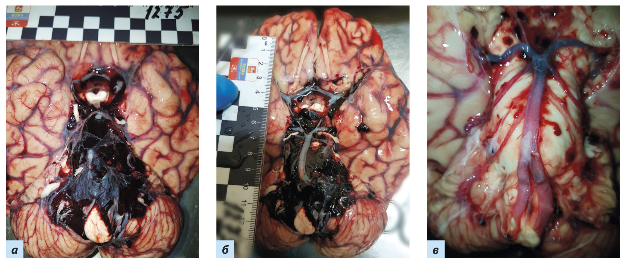 Внутреннее исследование трупа. В мягких тканях выявлены кровоизлияния: в проекции ссадин и ран в лобной и носовой областях и в правой височной области. Обнаружено сплошное БСАК, которое располагалось в мостомозжечковой и базальной цистернах и распространялось книзу до уровня 1–2-го сегмента шейного отдела позвоночника, с максимальной толщиной (до 0,6 см) в мостомозжечковой цистерне (рис. 2).