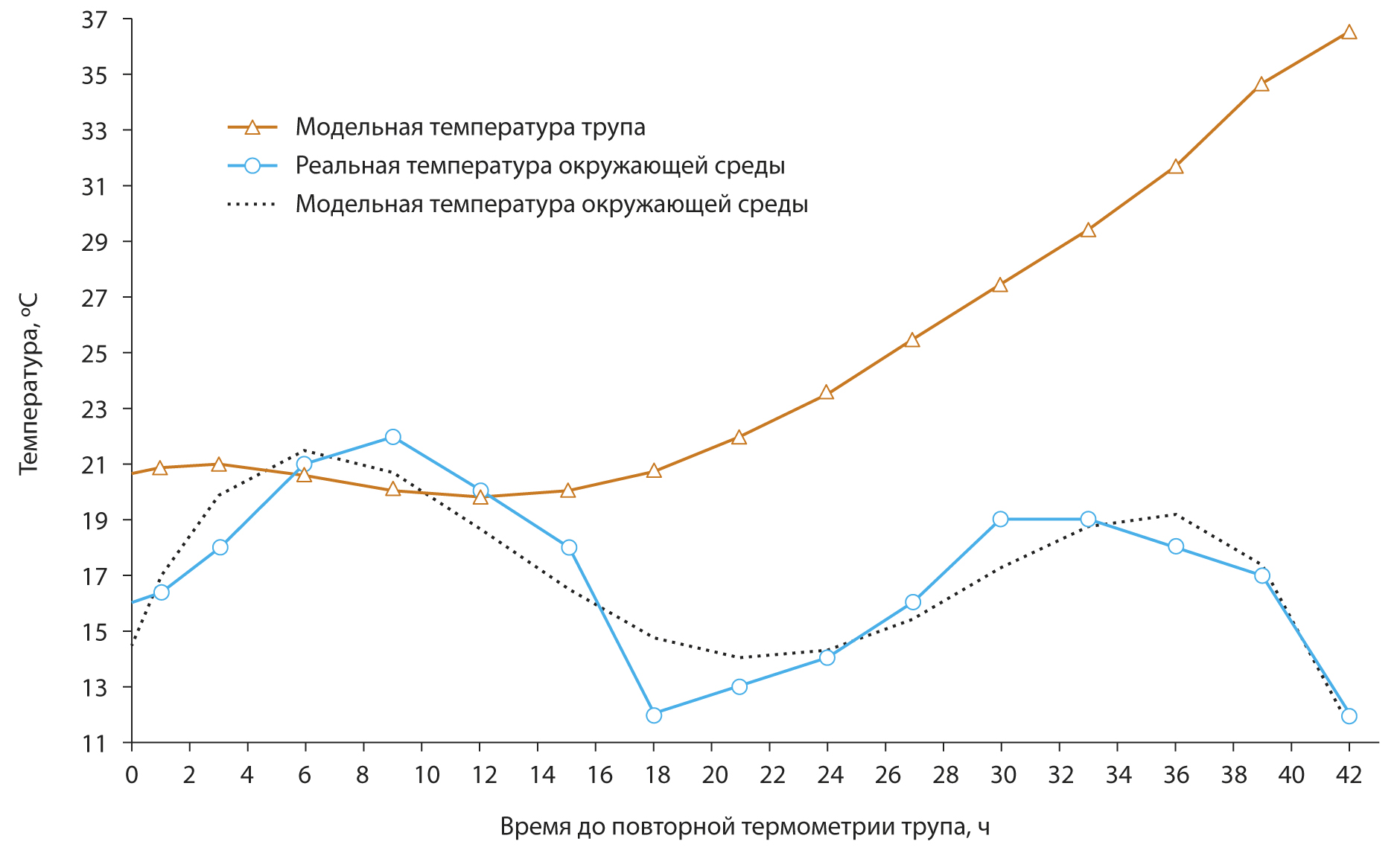 При расчётах на основе зарегистрированного в момент первой термометрии трупа значения температуры воздуха без учёта её предшествующих изменений (т. е. принимая температуру среды при первой термометрии трупа за константу) получаем ДНС равную 25,1 ч. Столь значительная ошибка объясняется тем, что за 10 ч до осмотра трупа температура окружающей среды сначала сравнялась, а затем превысила температуру в диагностической зоне трупа (см. рис. 1). Из-за этого температура трупа стала расти, а затем сразу после нового падения температуры окружающей среды вновь начала уменьшаться, после чего подверглась динамической термометрии в ходе осмотра трупа.