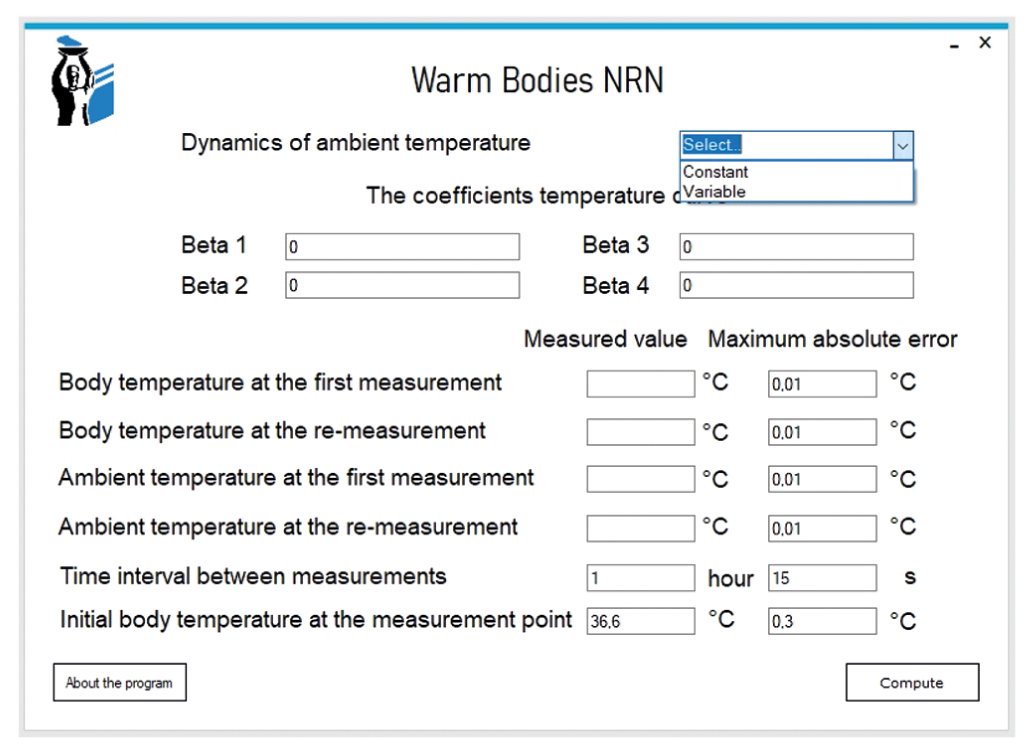 Для избавления пользователя от выполнения трудоёмких математических операций изложенный алгоритм определения ДНС и её погрешностей был реализован в формате программы для ЭВМ Warm Bodies NRN (свидетельство о государственной регистрации № 2021611972). Данная программа предназначена для определения ДНС на основе закона охлаждения Ньютона–Рихмана как в условиях постоянной, так и изменяющейся температуры внешней среды. Диагностической точкой в рамках данного физического закона могут служить только поверхностные ткани трупа. Программа поддерживает любые полиномиальные аппроксимации температурного тренда внешней среды 1–4‑й степени. При постоянной температуре окружающей среды приложение находит ДНС аналитически по формуле H. Rainy [6], являющейся следствием уравнения (1). В условиях изменяющейся температуры внешней среды программа определяет ДНС, решая неявные функции (5) и (6), предварительно сгруппировав все слагаемые и множители в правых частях уравнений и приравняв их к нулю. Поиск корней неявных функций приложение реализует методом касательных Ньютона, который имеет высокую скорость сходимости, и с его помощью приближенное значение корня с точностью до 6 знаков находится всего за 3–15 итераций. Затем программа рассчитывает предельные абсолютные погрешности определения ДНС с учётом инструментальных погрешностей средств измерения температуры и времени на основе математической модели косвенного измерения. Стартовое окно программы приведено на рис. 2.