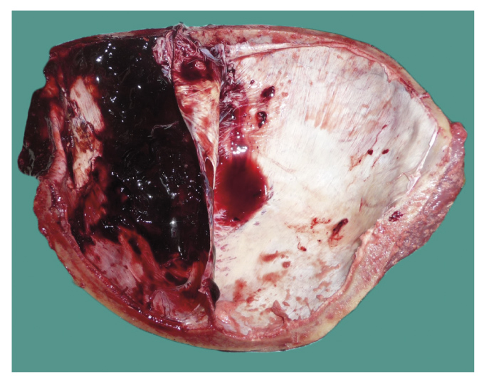 Рис. 1. Левосторонняя субдуральная гематома вдоль сагиттального синуса (зона противоудара) в виде сгустка крови.