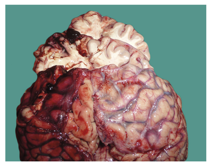 Извилины головного мозга уплощены, борозды между ними резко сужены. Под мягкой мозговой оболочкой практически на всём протяжении выпуклой поверхности левого полушария обнаружено очагово-диффузное субарахноидальное кровоизлияние. Здесь же на разрезах в коре и подлежащем белом веществе левого полушария большого мозга местами прослеживаются множественные мелкоточечные и полосовидные кровоизлияния с геморрагическим пропитыванием окружающих тканей (рис. 2).