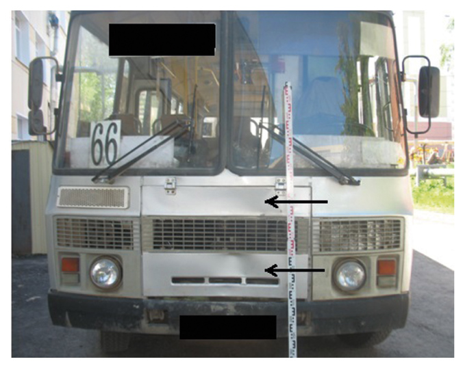 По результатам назначенных экспертиз (ситуационная, медико-криминалистическая и автотехническая) для уточнения механизма образования некоторых повреждений у гражданина Ш. установлено следующее. В момент совершения ДТП скорость движения автобуса марки ПАЗ-4234 составляла около 15,9 км/ч (судя по длине следа торможения колёса автобуса на покрытии дороги). При этом гражданин Ш. находился в вертикальном или близком к нему положении, обращённым правой боковой стороной к передней части наезжающего автобуса. От удара наружных частей автобуса у потерпевшего произошёл разрыв правого акромиально-ключичного сочленения, а также образовались кровоподтёки на правой половине тела. Одновременно с этим на передней части капота автобуса возникли следы деформации, которые чётко соответствовали высоте расположения повреждений на правой половине тела потерпевшего (рис. 3).