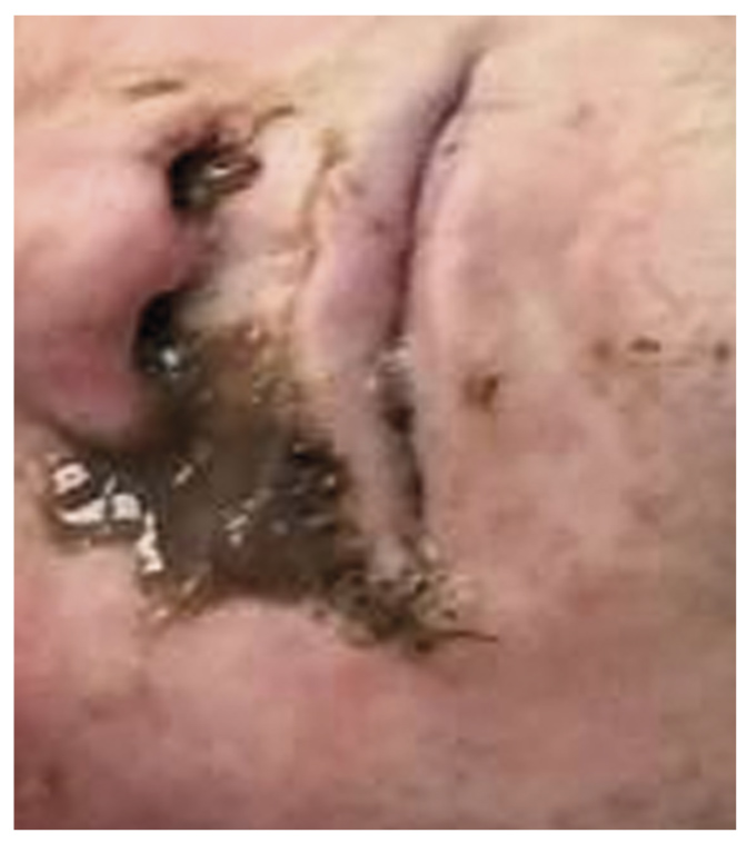 Рис. 6. Длительное потребление морфина: наличие в области локтевых ямок «колодцев», уплотнения кожи в виде кнопок, туннели.