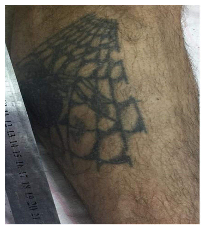 Рис. 4. Отравление морфином: татуировка, которую делают иногда наркоманы, а также указывающая на отбывание в местах лишения свободы.