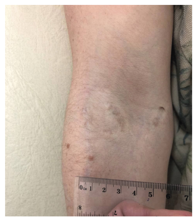 Рис. 7. След от инъекции со следами от расчёсывания кожи (введение героина). Множественные линейные рубцы предплечья (исход заживления резаных ран).