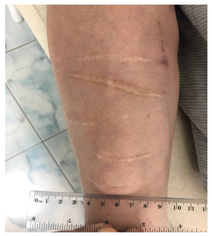 Fig. 7. Injection mark with skin scratching marks (heroin injection). Multiple linear scars of the forearm (outcome of incised wounds healing).
