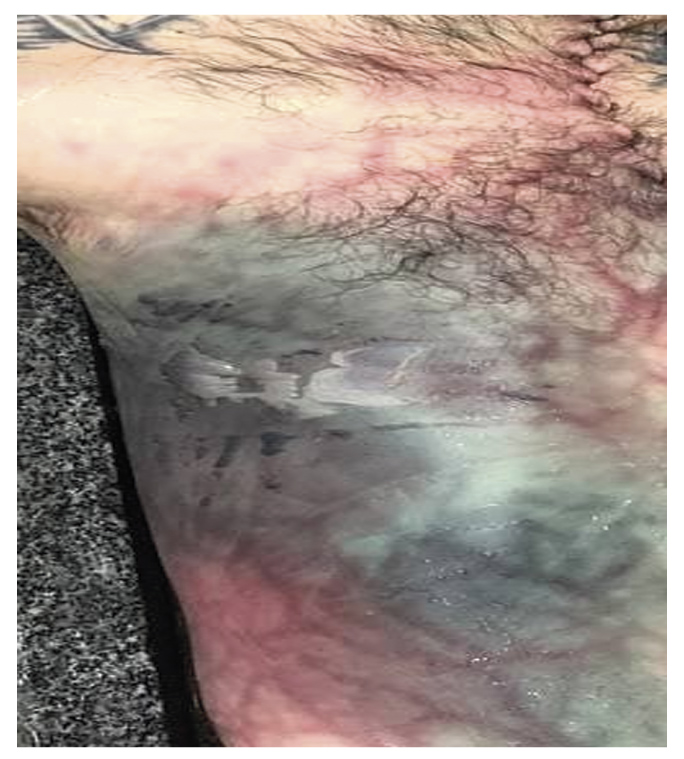 Рис. 5. Передозировка трамадола: множественные следы инъекций в паховой области, передней поверхности бедра.