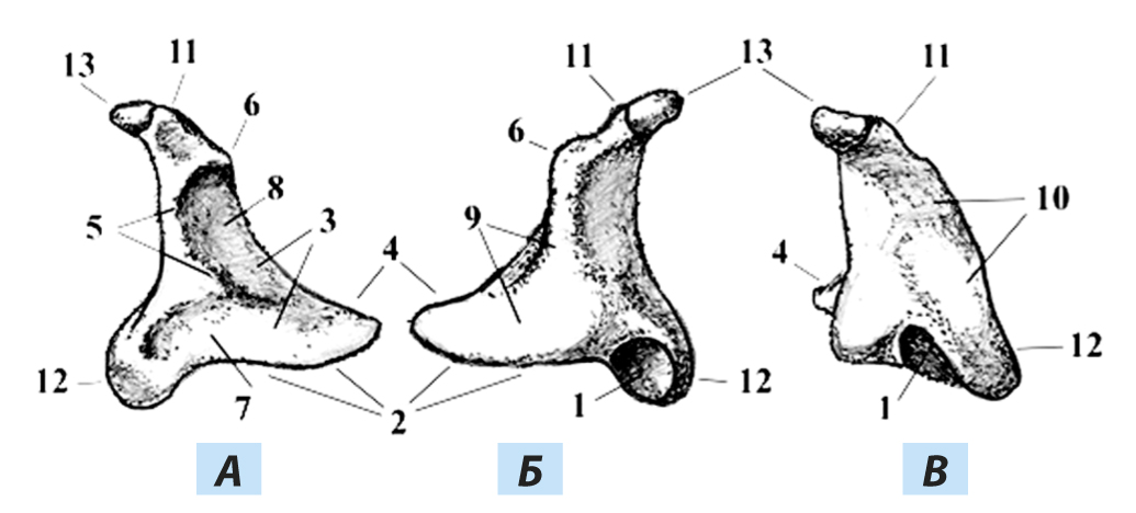 Рис. 1. Правый черпаловидный хрящ: латеральная (А), медиальная (Б) и задняя (В) поверхности. 1. Суставная поверхность. 2. Основание. 3. Латеральная поверхность (место прикрепления мышц). 4. Голосовой отросток (место прикрепления голосовой связки). 5. Дугообразный гребешок. 6. Холмик. 7. Продольная ямка (место прикрепления щиточерпаловидной мышцы). 8. Треугольная ямка. 9. Медиальная поверхность. 10. Задняя поверхность. 11. Верхушка. 12. Мышечный отросток (место прикрепления перстнечерпаловидных мышц). 13. Рожковидный хрящ.