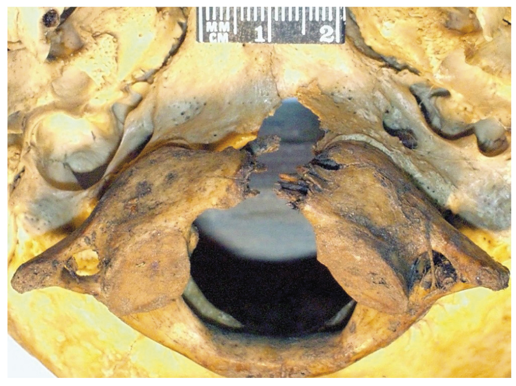 Рис. 1. Входное огнестрельное пулевое повреждение I шейного позвонка и затылочной кости, вид спереди снизу.