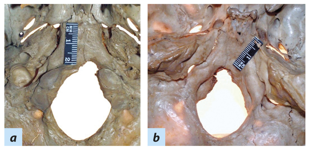 Рис. 2. Общий вид со стороны наружной поверхности основания черепа (а) и его полости (b) базилярной части затылочной кости с краевым входным огнестрельным пулевым повреждением.