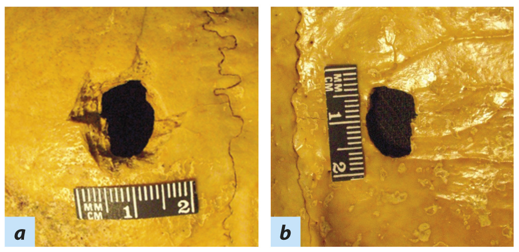 Рис. 3. Общий вид со стороны наружной (а) и внутренней (b) костных пластинок выходного огнестрельного пулевого дырчатого перелома левой теменной кости.