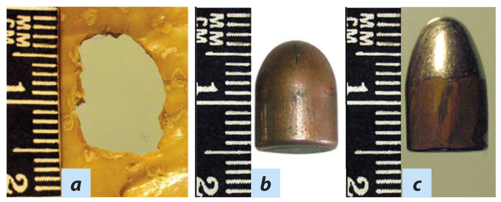 Как отмечает V. J. DiMaio [11], по размеру входного отверстия в кости нельзя определить конкретный, а можно лишь исключить некоторые калибры пули. Например, отверстие диаметром 7,65 мм исключает причинение его пулей калибра 9 мм (.38). С другой стороны, из-за определённой эластичности кости пуля калибра 9 мм может причинить дефект диаметром 8,5 мм. Характер огнестрельного дефекта в кости определяется не только диаметром пули, но и её конструкцией. Например, при выстрелах пулями .25 АСР (Automatic Colt Pistol; 6,35 мм, оболочечная) и .22 (5,45 мм, свинцовая безоболочечная) оказалось, что в первом случае диаметр отверстия в кости составлял 6–7 мм, а во втором — от 5 до 11 мм [11]. Деформированная пуля причиняет дефект большего диаметра, чем недеформированная [12].