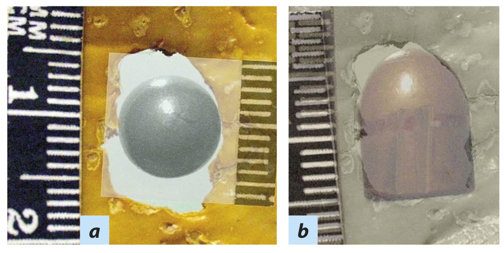 Сравнительное исследование методом наложения (фотосовмещения) [7, 16] проведено в соответствии с принципами, принятыми в криминалистической экспертизе [16, 17], и включало 4 этапа. На первом этапе из баллистической коллекции выбраны пули-эталоны — оболочечные пули патронов 9×18 ПМ (см. рис. 4, b) и 9×19 Парабеллум (см. рис. 4, c). На втором этапе с одного и того же фокусного расстояния и угла фотосъёмки получены цифровые фотоизображения дырчатого перелома левой теменной кости со стороны внутренней костной пластинки (как наиболее полно сохранившего групповые свойства травмирующего предмета) и оболочечной пули-эталона патрона 9×18 ПМ со стороны головной части и в боковой профиль. На третьем и четвёртом этапах при помощи графического редактора Adope Photoshop 6.0 изображения оболочечной пули-эталона патрона 9×18 ПМ со стороны головной части и в боковой профиль переводились в зеркальные, которые в последующем были наложены на изображение дырчатого перелома левой теменной кости. Установлено, что наибольшие боковые контуры зеркально отображённой оболочечной пули-эталона патрона 9×18 ПМ чуть меньше границ дырчатого перелома, указывающих размерные характеристики травмирующего предмета (рис. 5, а), и что контуры бокового профиля зеркально отображённой оболочечной пули-эталона патрона 9×18 ПМ практически полностью соответствуют границам дырчатого перелома, отобразившим размерные характеристики травмирующего предмета (рис. 5, b).