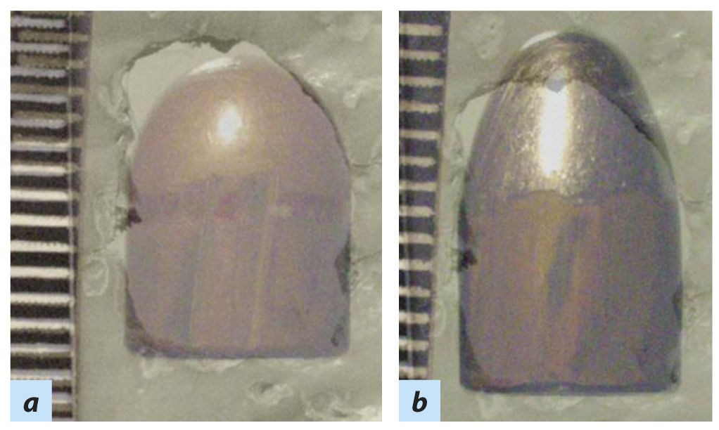 Рис. 5. Определение калибра (а) и вида (б) огнестрельного снаряда (пули) методом наложения (фотосовмещения) с использованием оболочечной пули-эталона патрона 9×18 ПМ.