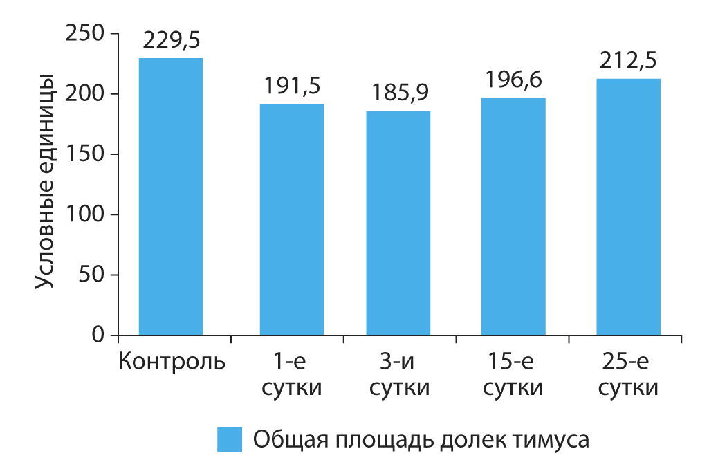 На 25-е сут, в фазе адаптивной перестройки тканей, общая площадь тимуса была выше показателей конечной фазы пролиферации на 8,1% и практически не отличалась от контроля.
