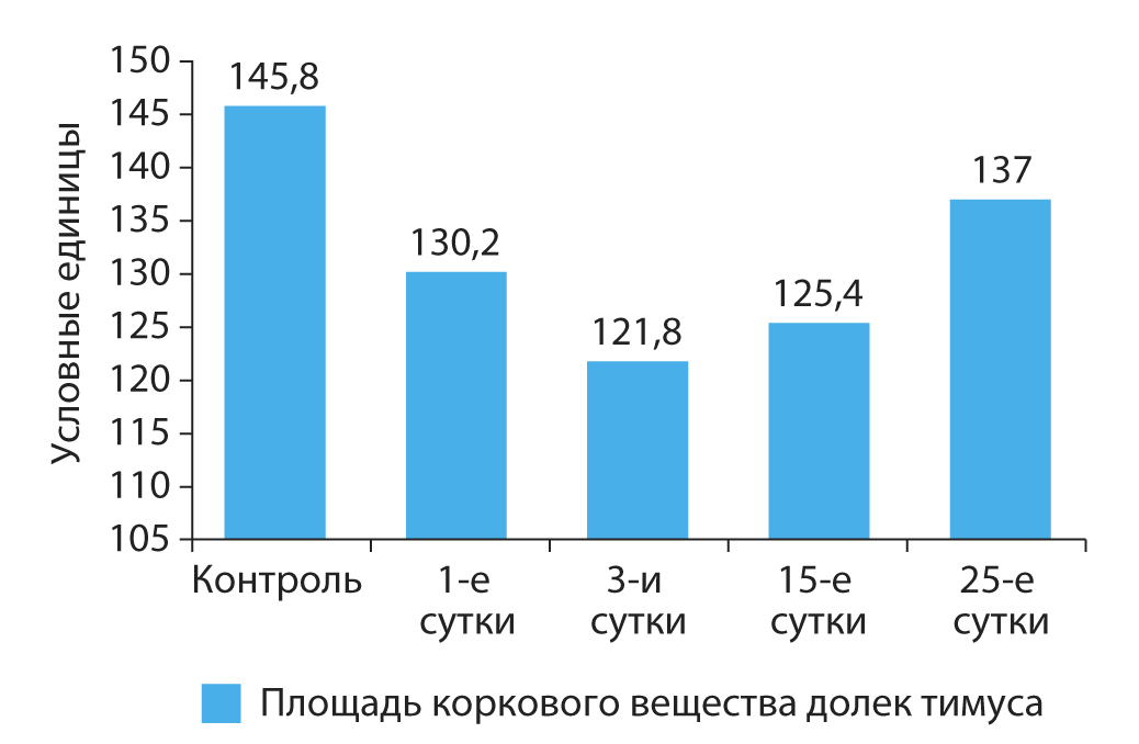 У животных в фазе альтерации (1-е сут) площадь коркового вещества тимуса снизилась относительно контроля на 10,7% (р <0,05). Площадь коркового слоя в стадии острого воспаления (3-и сут) была самой низкой — на 16,5% меньше показателей контроля и на 6,5% ниже показателей фазы альтерации.