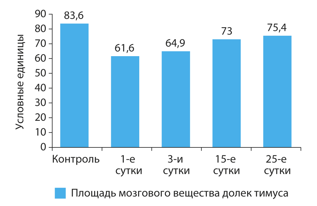 Таким образом, механическая травма, рассматриваемая как стресс-реакция, вызывает инволютивные изменения в тимусе, характеризующиеся изменением показателей площади коркового и мозгового вещества тимуса и закономерной динамикой изменения площади долек тимуса на этапах регенерации раны (после нанесения травмы их площадь уменьшалась с последующим восстановлением).