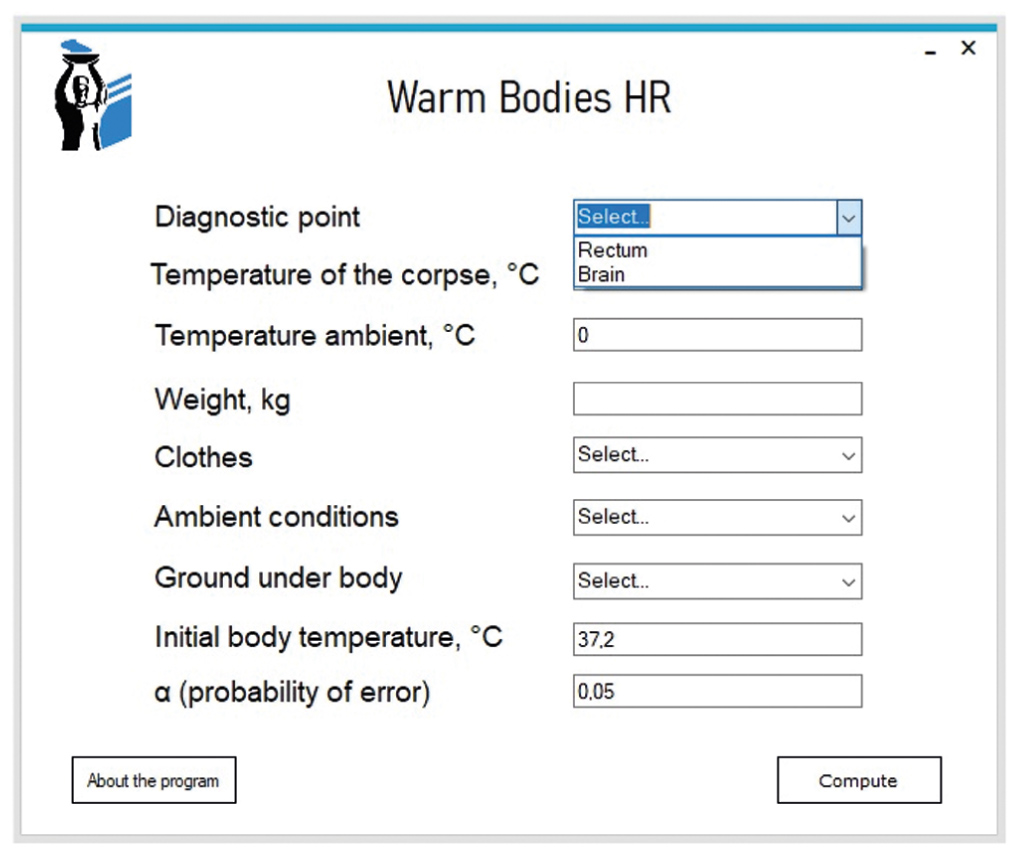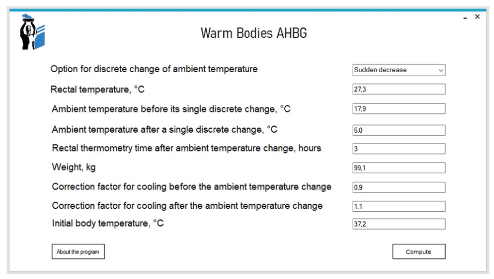Математическая модель приложения Warm Bodies AHBG основана на модификации L. Althaus и C. Henssge [11] для случая однократного понижения температуры внешней среды и модификации P. Bisegna и соавт. [12] для случая повышения внешней температуры аналогичного характера. Обе указанные модификации метода Henssge при написании кода программы также были оптимизированы. В частности, в коде помимо учёта влияния на охлаждение трупа однократного понижения или повышения температуры внешней среды была дополнительно заложена возможность учёта смены условий охлаждения мёртвого тела (изменение характера одежды и ложа трупа, а также погодных условий) после изменения внешней температуры. При этом в соответствии с исходными математическими моделями первоначальный и конечный температурные режимы внешней среды не должны превышать 23,2°С [11, 12].