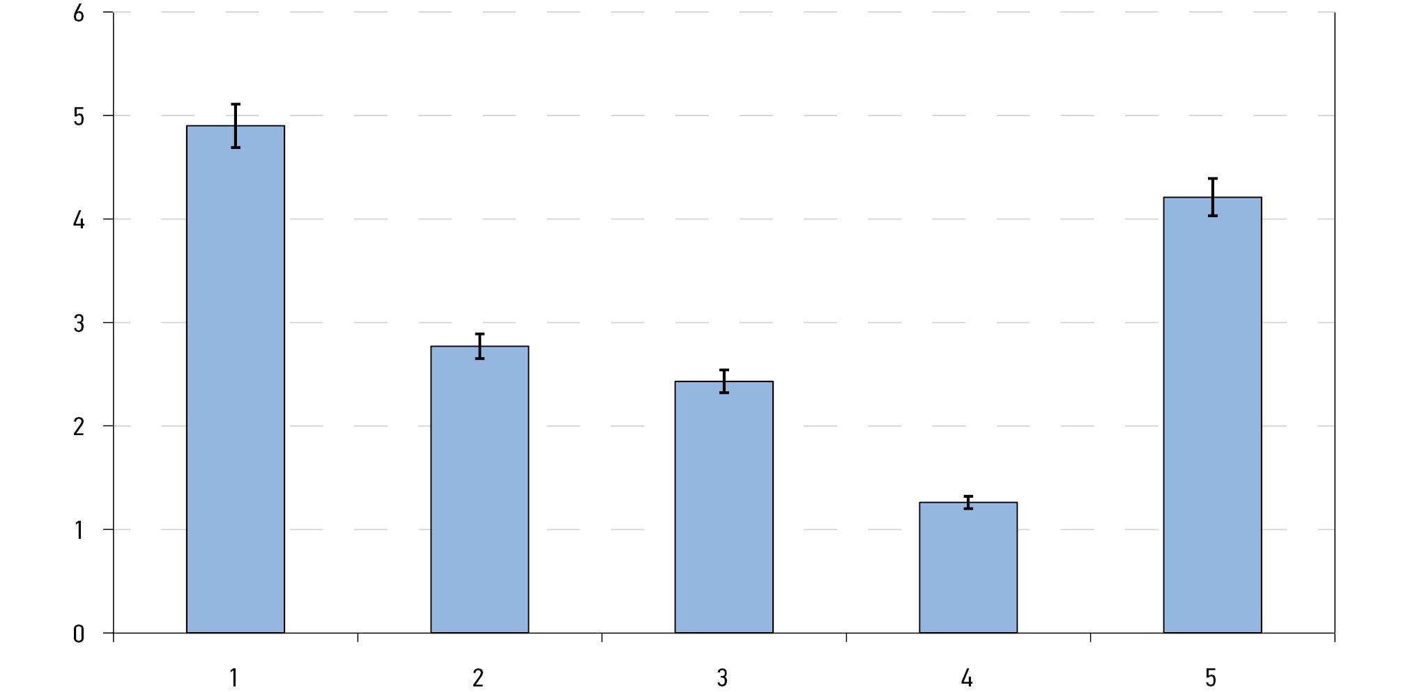 Рис. 1. Структура диабетических ком и 95% доверительный интервал: (по оси абсцисс) 1 ― диабетическая прекома, 2 ― гипер-осмолярная некетоацидотическая кома, 3 ― гиперосмолярная кетоацидотическая кома, 4 ― кетоацидотическая кома, 5 ― гипогликемическая кома; (по оси ординат) доля встречаемости диабетических ком (%).