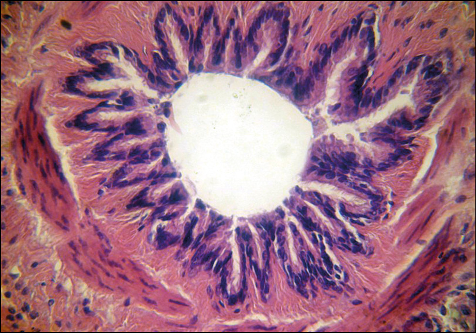 При судебно-гистологическом исследовании препаратов лёгких просветы альвеол щелевидны или расширены с выпрямлением и разрывами межальвеолярных перегородок (рис. 1), расширением межальвеолярных пор и относительным запустеванием капилляров, укорочением альвеолярных мешочков, в отдельных полях зрения безвоздушны, выполнены гомогенными слабоэозинофильными массами со значительной примесью эритроцитов, несколько увеличенных в объёме, относительно нечёткими контурами, дополненных обнаружением единичных десквамированных альвеолоцитов и клеток типа макрофагов, в том числе с бурым пигментом в цитоплазме. Просветы бронхиол фестончаты с гиперхромными нитевидно вытянутыми ядрами высоких клеток призматического эпителия с апикальной вакуолизацией и формированием «фигур колосьев» (рис. 2), содержат в небольшом количестве неравномерно распределённые слоистые массы слизи и слитно расположенные эритроциты. Перибронхиальные мелкие сосуды, прилегающие к просветам бронхиол в виде «клеточных тяжей», малокровны, с переориентацией просветов вдоль окружности бронхиол.