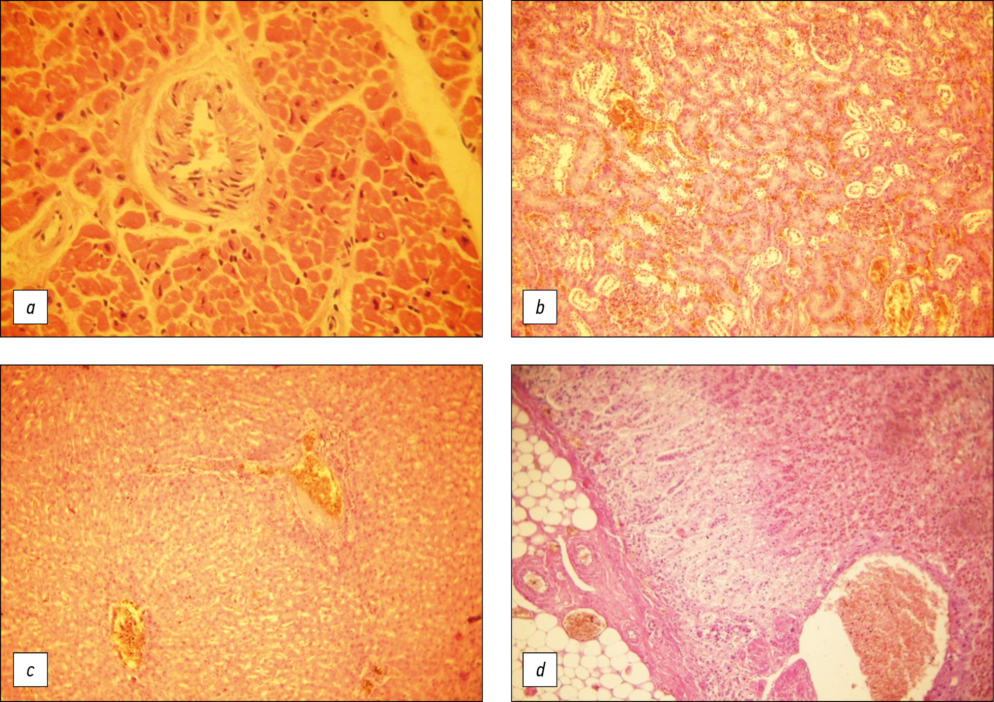 Рис. 3. Микропрепараты: a ― гелий, сердце, артериолоспазм; окраска гематоксилином и эозином; ув. 40; b ― гелий, печень, венозное полнокровие; окраска гематоксилином и эозином; ув. 10; c ― гелий, почка, венозное полнокровие; окраска гематоксилином и эозином; ув. 10; d ― гелий, надпочечник, венозное полнокровие; окраска гематоксилином и эозином; ув. 10.