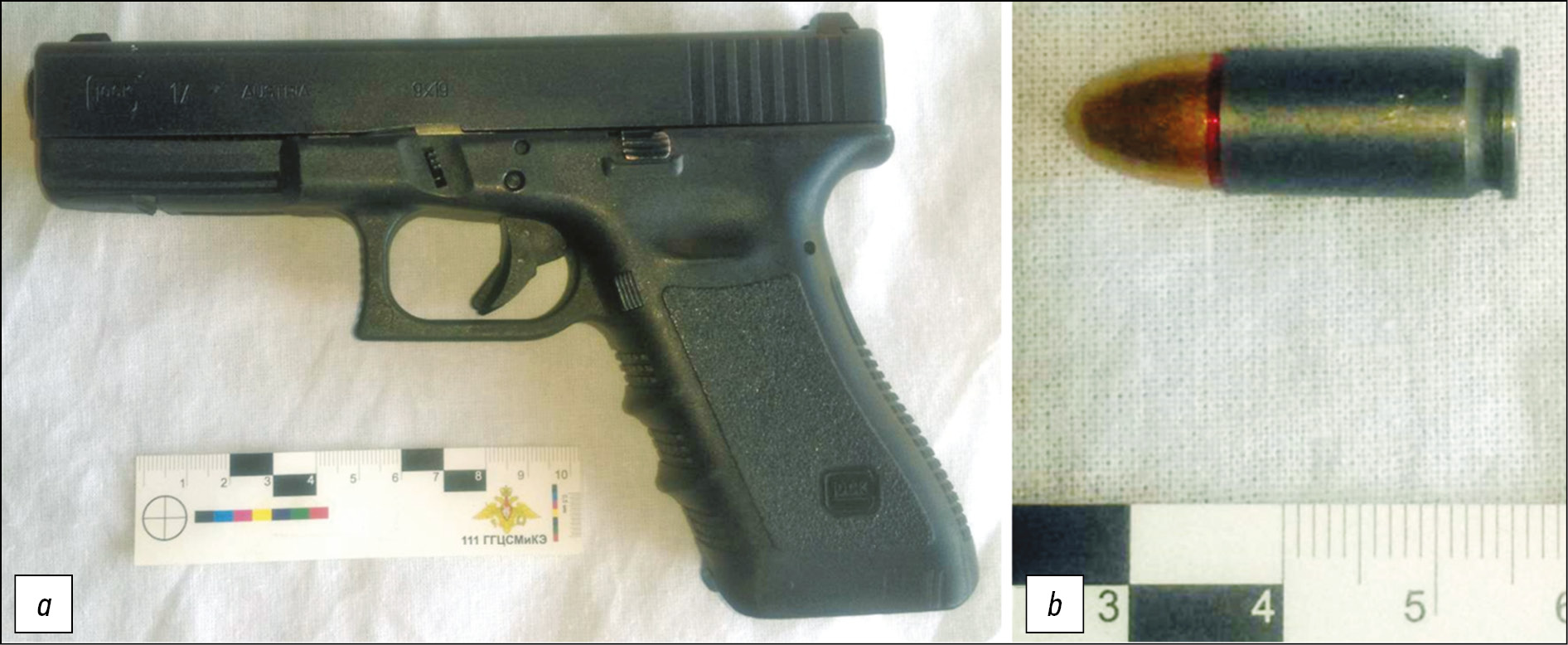 Рис. 1. Короткоствольное огнестрельное оружие и снаряд: а ― огнестрельное оружие (пистолет Glock 17); b ― патроны калибра 9×19 Parabellum.