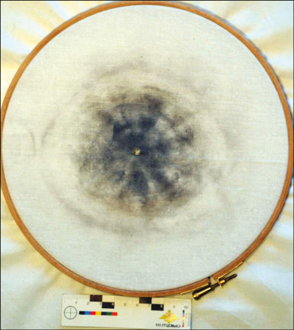 Для проведения сравнительного эксперимента все мишени разделены на две группы. Первая группа мишеней представлена неизменённой сухой тканью. Во второй группе мишеней ткань, расположенную вертикально, смачивали проточной водой из пульверизатора. Через 10 секунд, необходимых для пропитывания, ткань вывешивали в вертикальное положение на подложку из плотного картона, далее производился выстрел. Огнестрельное оружие (Glock 17) закрепляли на специально оборудованной станине, дульный конец был направлен в сторону мишени под углом 90º. Выстрелы производили с заранее установленного расстояния ― 5 см, 10 см, 20 см и далее с шагом 10 см до 100 см включительно. На каждом расстоянии произведено по 10 выстрелов, затем отобрано по 3 мишени с наиболее выраженными морфологическими изменениями: термически изменённые волокна на лицевой поверхности мишени, по краю огнестрельного повреждения, по глубине проникновения пояска обтирания. После этого ствол огнестрельного оружия очищали.