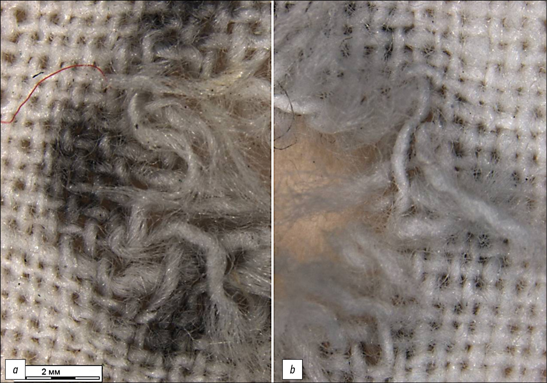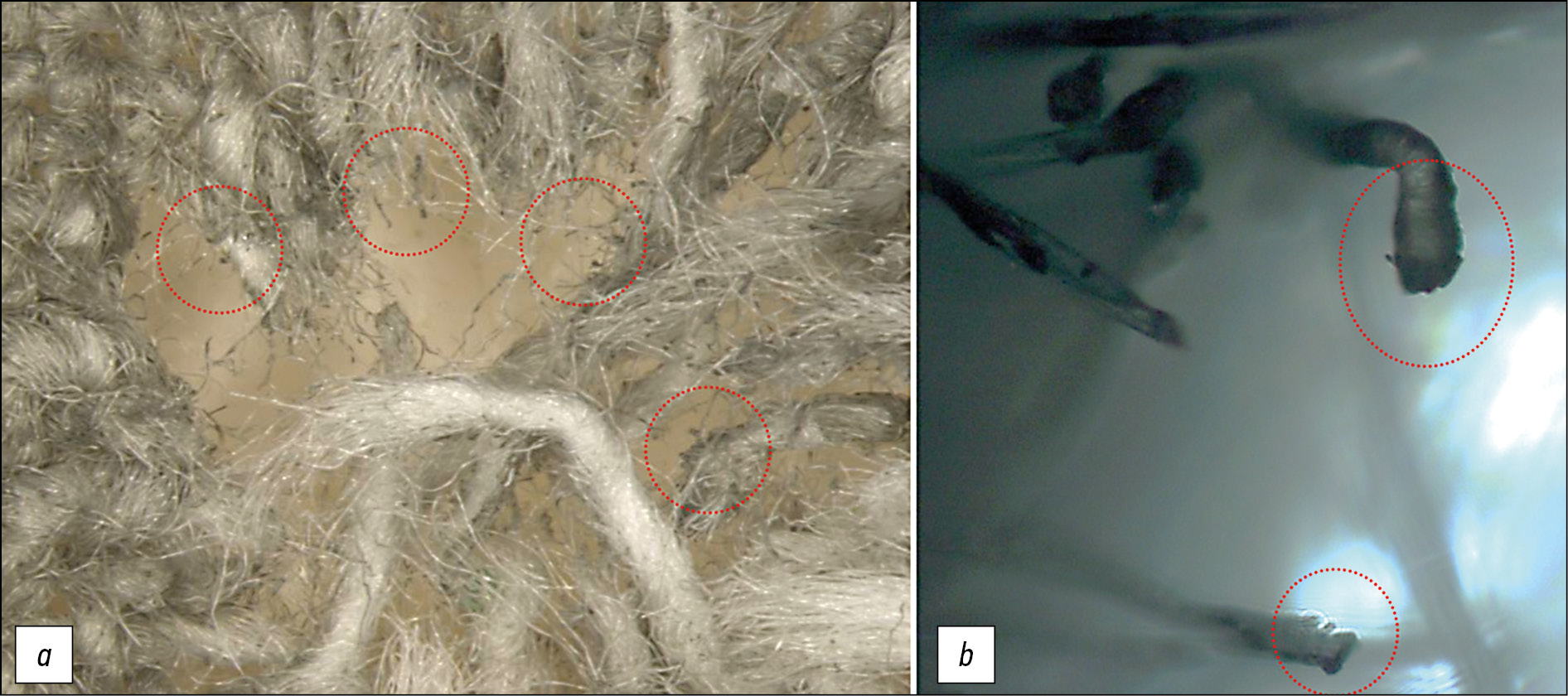Fig. 3. Fire damage to a dry target from a distance of 10 cm: а ― hemp-shaped and flask-shaped fibers of black color are (highlighted with a red dotted line), ×20; b ― hemp-shaped and flask-shaped fibers of black color are (highlighted with a red dotted line), ×100.