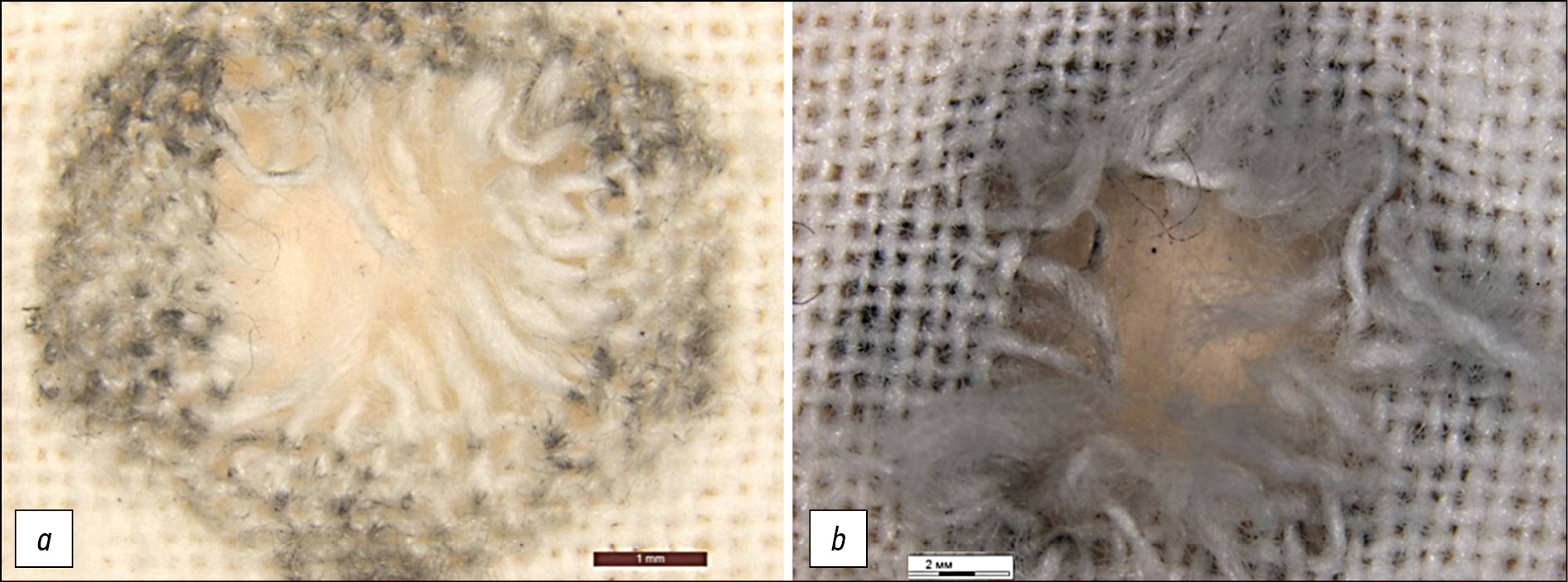 Fig. 4. Damage to a dry calico target caused by a shot from a Glock 17 gun from a distance of 40 cm: а ― the front side of the target; b ― the wrong side of the target.