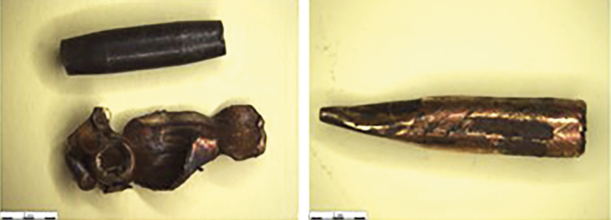 Рис. 1. Вид пуль патрона 5,45×39 после пробития преграды: а ― из триплекса; b ― комбинированной преграды из керамогранита с пенобетоном и биологической мишени.