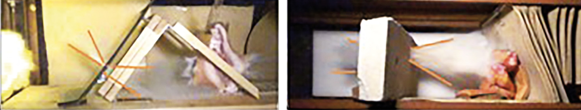 Рис. 2. Покадровое воспроизведение прохождения огнестрельного снаряда через преграду и биологическую мишень: а ― триплекс; b ― комбинированная преграда из керамогранита и пенобетона.