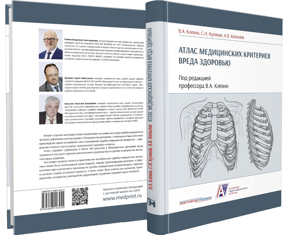 Издательством «Практическая медицина» и Ассоциацией судебно-медицинских экспертов выпущено в свет второе издание коллективной монографии «Атлас медицинских критериев вреда здоровью» (далее ― Атлас) под общей редакцией доктора медицинских наук, заведующего кафедрой судебной медицины ФУВ ГБУЗ МО «Московский областной научно-исследовательский клинический институт имени М.Ф. Владимирского», главного специалиста по судебно-медицинской экспертизе Министерства здравоохранения Московской области, сертифицированного врача высшей квалификационной категории по судебно-медицинской экспертизе, патологической анатомии и организации здравоохранения, академика РАЕН, РАМТ и ВАНКБ, президента Ассоциации судебно-медицинских экспертов, главного редактора журнала «Судебная медицина» профессора В.А. Клевно (рисунок) [1].