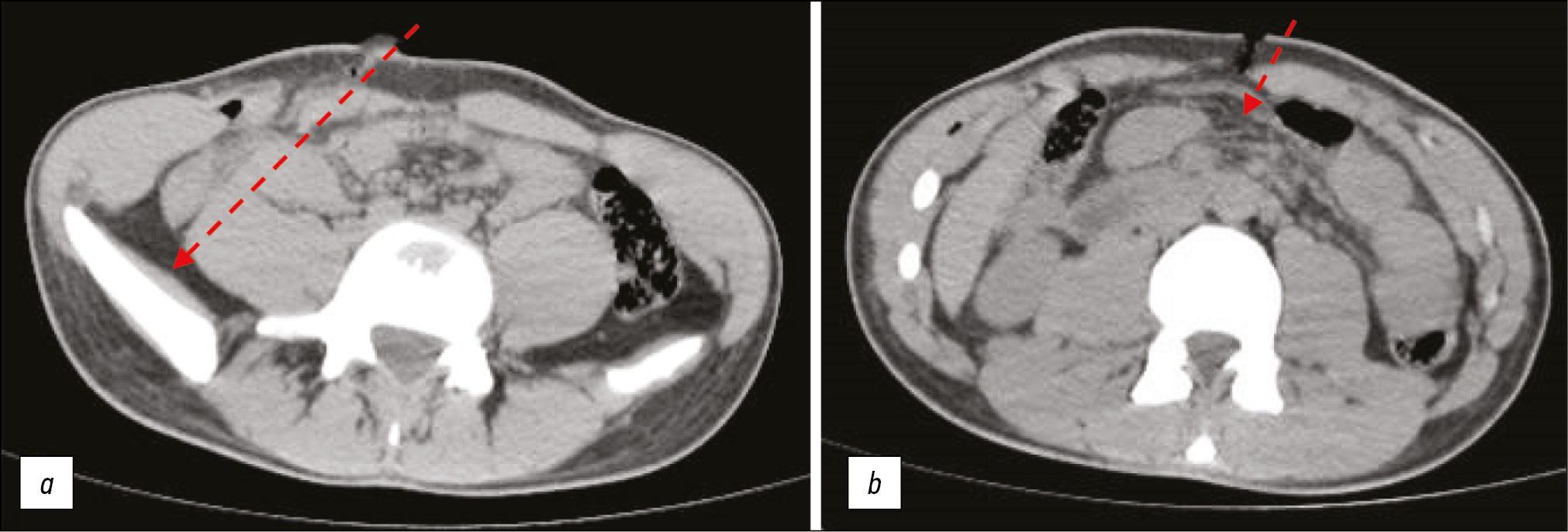 Рис. 1. Направление и особенности раневых каналов колото-резаных повреждений по данным компьютерной томографии потерпевшего М.: а ― проникающее повреждение брюшной полости справа (стрелка); b ― проникающее повреждение брюшной полости в мезогастрии (стрелка). / Fig. 1. The direction and features of the wound channels of stab wounds according to computed tomography studies of the victim M.: а ― penetrating damage to the abdominal cavity on the right (arrow); b ― penetrating damage to the abdominal cavity in the mesogastrium (arrow).
