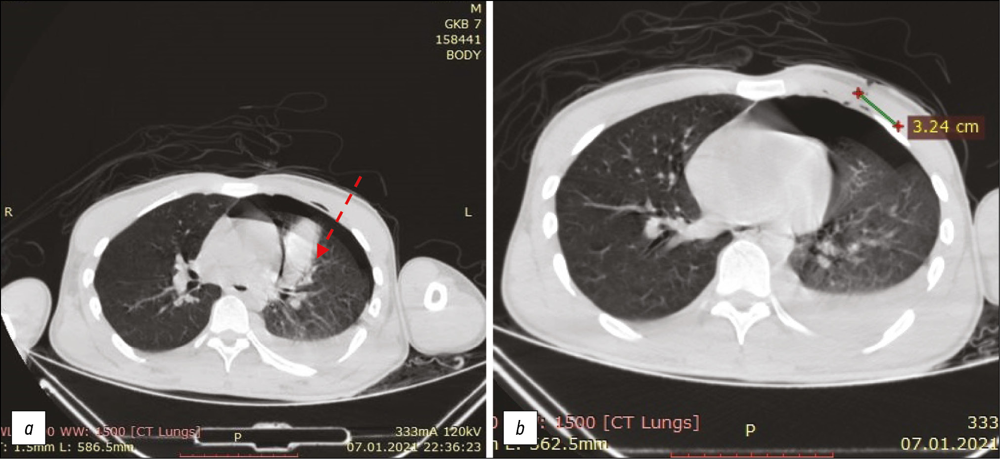 Рис. 2. Данные компьютерной томографии потерпевшего М.: а ― ателектаз левого лёгкого по ходу раневого канала (стрелка); b ― разметка смещения раневого канала на послойных снимках. / Fig. 2. Computed tomography data of the victim M.: а ― atelectasis of the left lung along the course of the wound canal; b ― marking of the displacement of the wound canal on layered images.