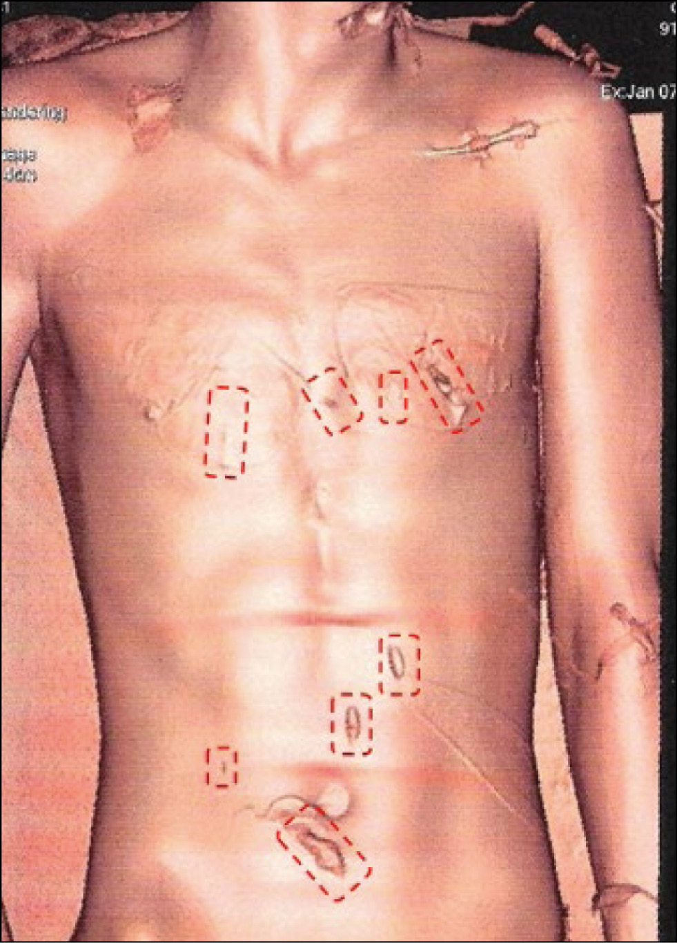 4. Fig. 3. A three-dimensional model of the torso of the victim M., constructed according to the results of computed tomography, with localization of stab-cut injuries.
