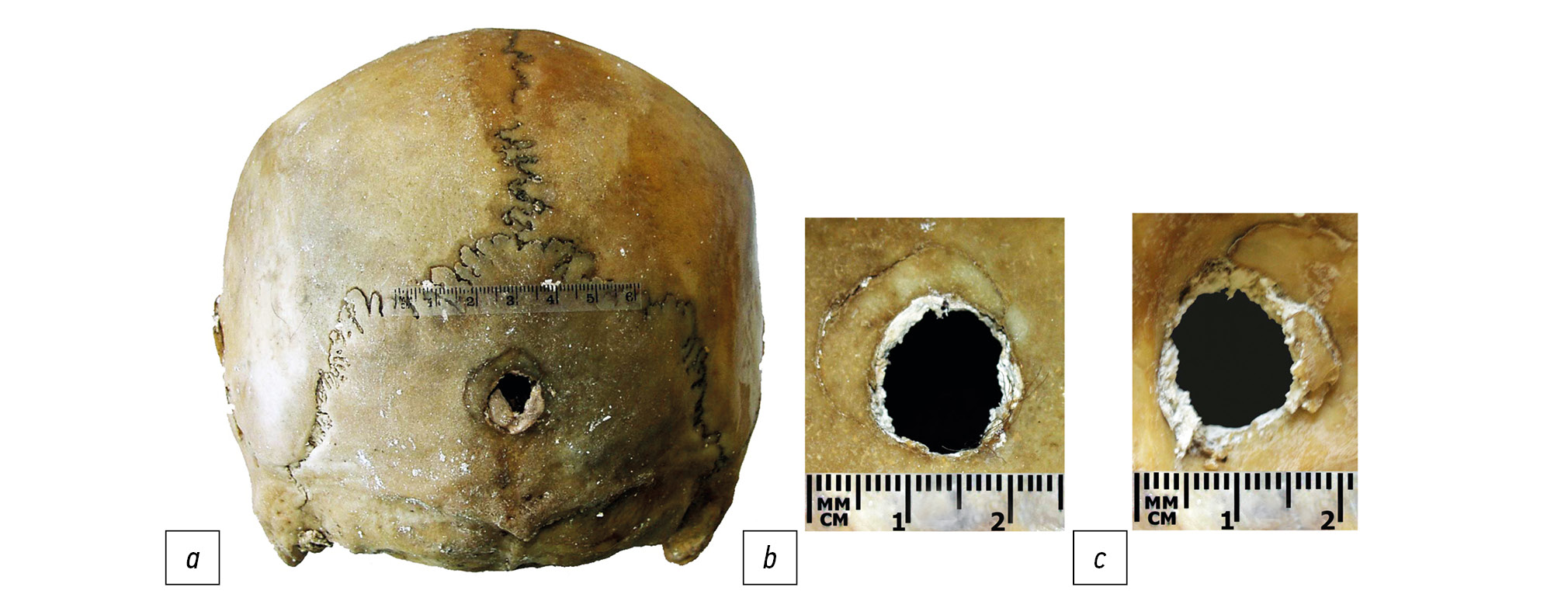2. Fig. 1. Skull, back view (a). Penetrating defect in the central part of the occipital bone squama, external view (b) and view from the cranial cavity (с).
