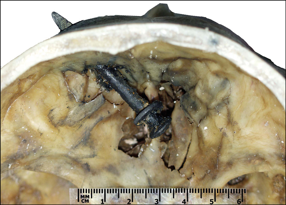 Из чешуи лобной кости, в области границы внутренней и средней трети глазничного края, из полости черепа наружу на длину 9 мм выступает конический конец металлического инородного тела с коррозированной поверхностью; его остриё ориентировано кпереди, влево и вверх (рис. 2). Компактный слой вокруг инородного тела прокрашен в тускло-чёрный цвет. В передней черепной ямке расположена видимая часть металлического, с коррозированной поверхностью инородного тела длиной 32 мм, зафиксированного в чешуе лобной кости (см. рис. 2); длинник инородного тела ориентирован сзади наперёд, снизу вверх, справа налево и образует с сагиттальной плоскостью угол ~45°. Внутренний конец инородного тела располагается в области петушиного гребня и дырчатой пластинки решётчатой кости, там же визуализируется оскольчатый перелом с дефектом костной ткани на участке 38×35 мм (см. рис. 2).