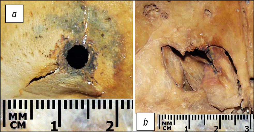 В чешуе лобной кости, с наружной поверхности черепа, в области границы внутренней и средней трети глазничного края имеется округлой формы сквозной дефект диаметром ~4,5 мм, края которого относительно ровные, без сколов компакты (рис. 3, a). От нижнего участка края дефекта в направлении к глазничному краю лобной кости отходят две расходящиеся под углом ~90° трещины: правая, длиной 21 мм, слепо затухает в области надпереносья; левая, пройдя 6 мм, резко поворачивает вправо и, пройдя 15 мм, примыкает к предыдущей трещине. Данные трещины ограничивают треугольной формы отломок наружного компактного слоя размерами 15×8 мм, вершина которого смещена кнаружи (см. рис. 3, а). Изнутри в проекции данного дефекта в стенке лобной пазухи имеется неправильный многоугольной формы дефект внутреннего компактного слоя размерами ~15×18 мм (см. рис. 3, b). Центры дефектов в чешуях затылочной и лобной костей проецируются на условную прямую линию, ориентированную в направлении сзади наперёд, несколько справа налево и снизу вверх.