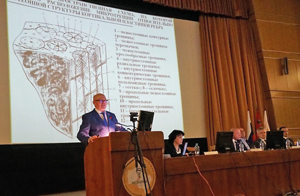 На первой пленарной сессии, посвящённой теоретическим, процессуальным, организационным и методическим основам судебно-медицинской экспертизы, был представлен ряд докладов. Сообщение профессора В.А. Клевно содержало комплексную судебно-медицинскую оценку морфологии и биомеханики переломов рёбер при травме тупым предметом, в том числе с учётом современного состояния научной проблемы.