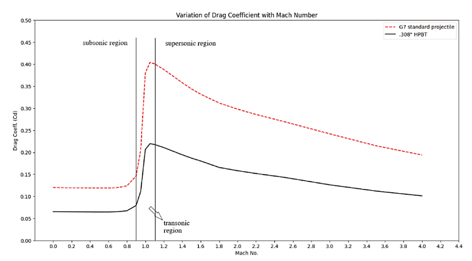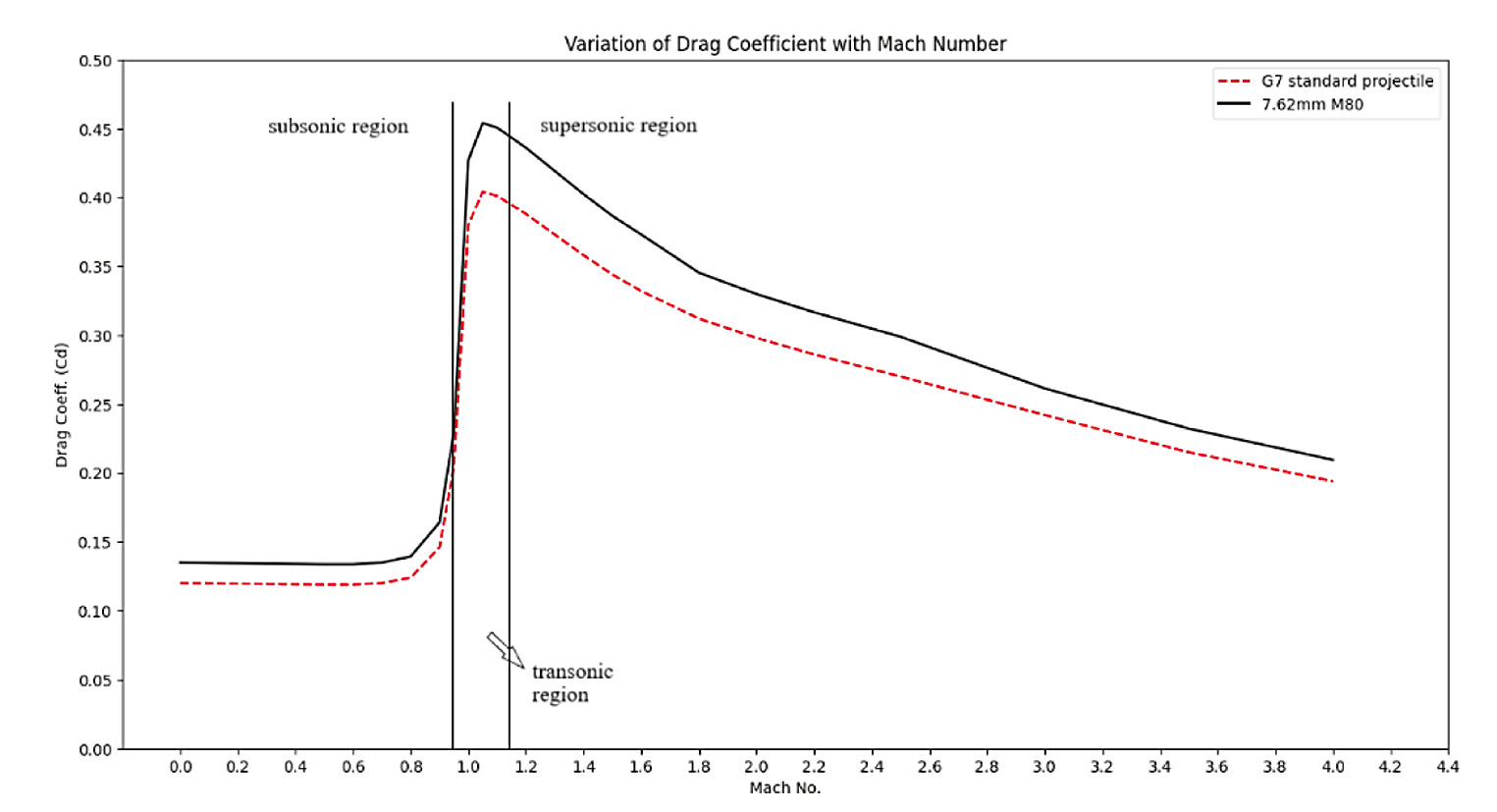 The drag coefficient can be calculated by scaling reference drag coefficient table by an appropriate form factor of the projectile. The form factor of a projectile can be theoretically calculated by using its geometric dimensions, as suggested by Savastre et al. (2020) [16] and previously by Surdu et al. (2015) [17]. Savastre et al. report that longer ballistic caps result in a low form factor/shape index and thus face a lower aerodynamic drag during flight. The usual method of calculating form factors of a bullet is by test firing a round to measure the ballistic coefficient across various velocity ranges, available in the form of compiled data published by manufacturers, such as one by Sierra Bullets [10]. Reddy et al. (2018) [18] reported their work on modelling of an AK-47 7.82 mm bullet to compute the CD at Mach 2 and the solution of a flat fire trajectory using C++ programming. Their result for the value of the drag coefficient has a 4% error from previously published data, and the simulated flat-fire trajectory has a reported error of <0.01%. The authors have also investigated the effects of change in altitude on the range and terminal velocity of the bullet.