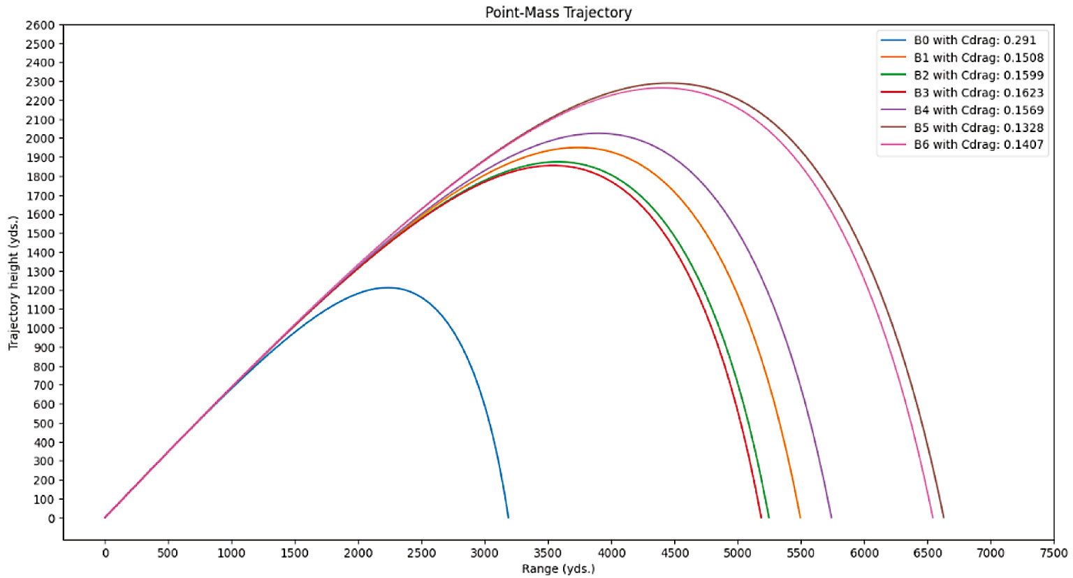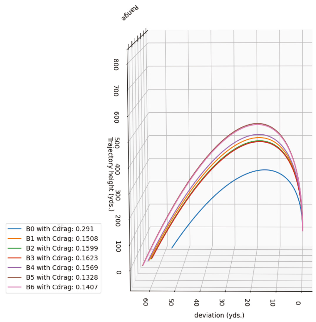 Being fired at a low angle of elevation, the apogee of the trajectories are around 4 times shorter than when fired at 35°. The range of flights are not reduced to the same extent however, with B0 falling short by 183 yards when compared to its 3186.74 yards range when fired at 35°. Similarly, the ranges of B1 thru B6 fly shorter distances than when fired at 35°, but not to the magnitude of the shortened trajectory heights. The time of flight of the bullet is significantly shorter when compared to high angle of elevation firing, with the flat-fired bullet taking around half the time as it took when fired high at 35°.