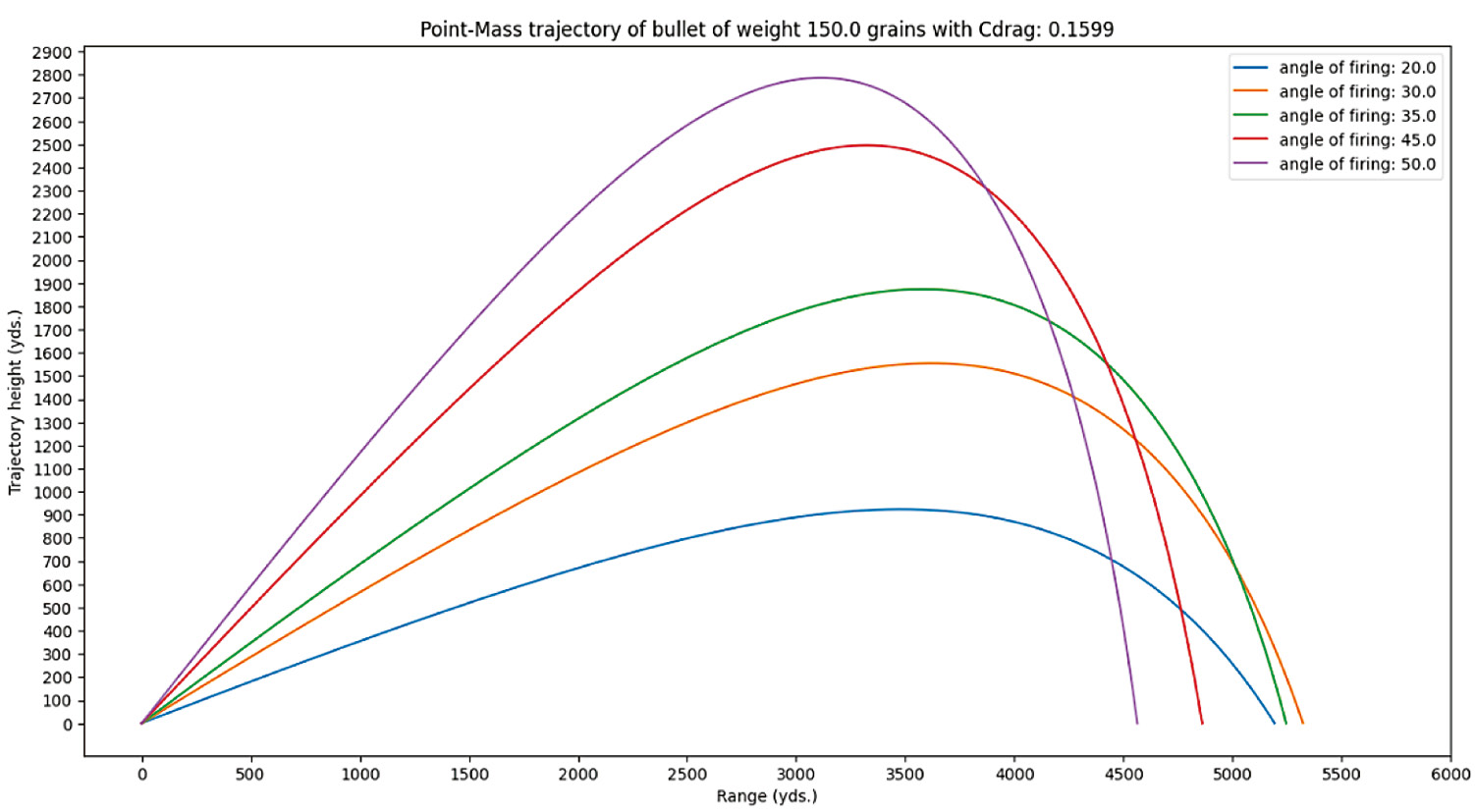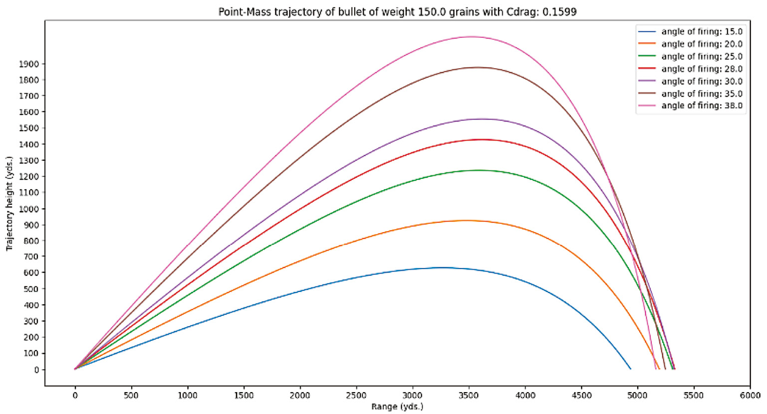 CONCLUSION: This project presents the numerical solution of equations of motion of the Point-Mass model for a bullet fired from a gun to computationally simulate its trajectory. A group of seven 7.62 mm/.308” rifle bullets were chosen as samples to simulate free-flight trajectories. The programming language Python is well-equipped to carry out numerical solutions of systems of differential equations owing to its library of in-built functions which assists in writing an efficient script and reduces computational load. This method of solution can be applied with suitable modifications in the field of forensic ballistics for the reconstruction of bullet trajectories and to form a conclusion based on the available evidence from a crime scene.