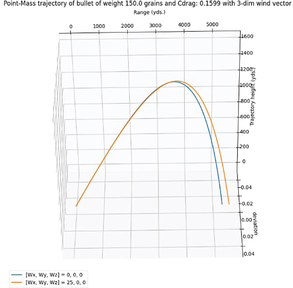 Wind = 0, 0, 0 the time of flight is 32.58 s the angle of impact is -70.22946346976369 degrees the range is: 5321.906787596593 yards the maximum height of the trajectory is: 1554.237484123316 yards the deflection in trajectory is: 0.0 yards Wind = 25, 0, 0 the time of flight is 32.68 s the angle of impact is -67.17979848766699 degrees the range is: 5574.052637946189 yards the maximum height of the trajectory is: 1562.7391482428018 yards the deflection in trajectory is: 0.0 yards