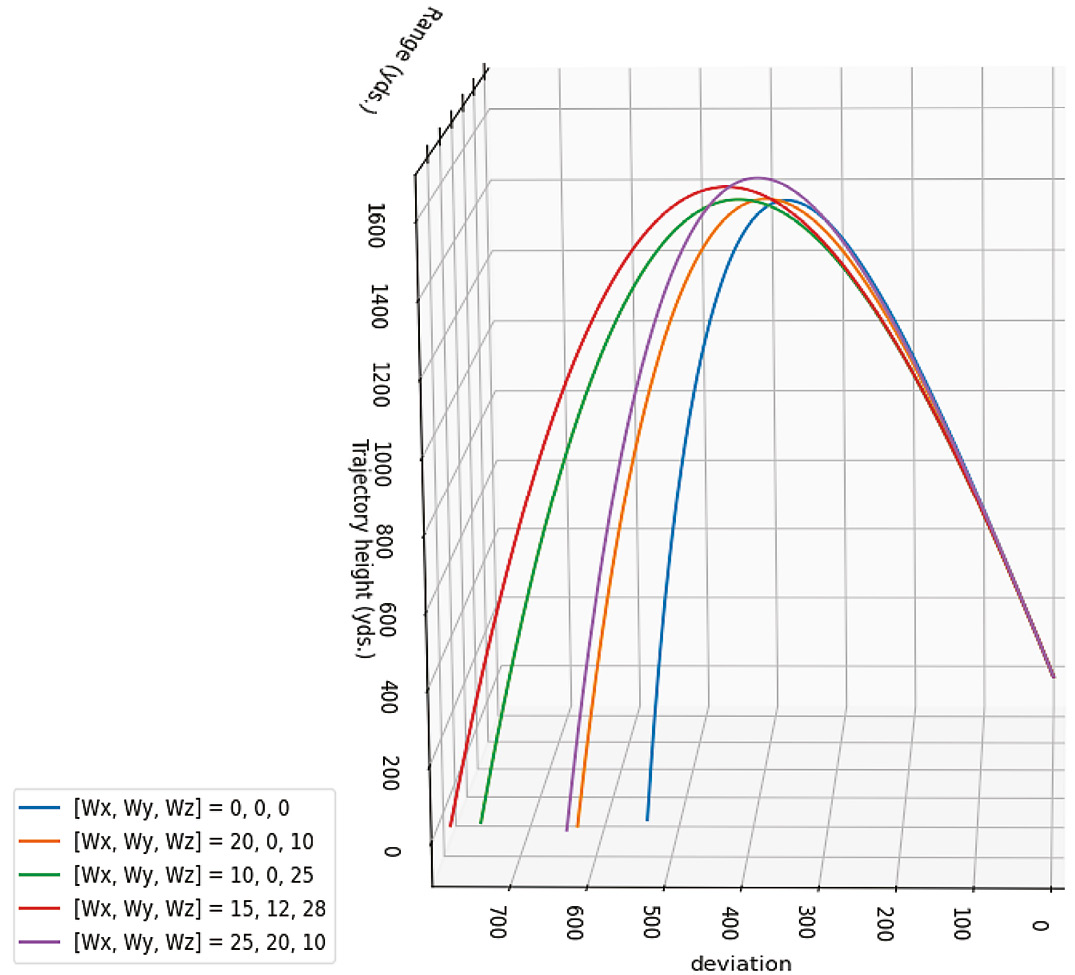 Point-mass equations of motion were solved with a 3-dimensional wind vector as input to observe the effects of various directions of constant wind on the trajectory characteristics. Bullet B2 was projected with only a tailwind (+ve x-axis, 25fps) at 30°. It is seen that the tailwind extends the range by around 250 yards and the angle of impact is flattened to 67° from 70°. The time of flight is only increased by 0.1s while the trajectory height increases by 8 yards (Fig. 7).