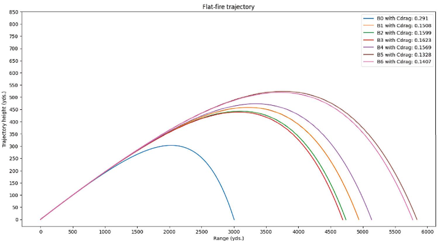 Flat-fire trajectory plots were generated for bullets B0 to B6 for a firing angle of 0.2° (12’) with a muzzle velocity of 2800 fps (Fig. 9).
